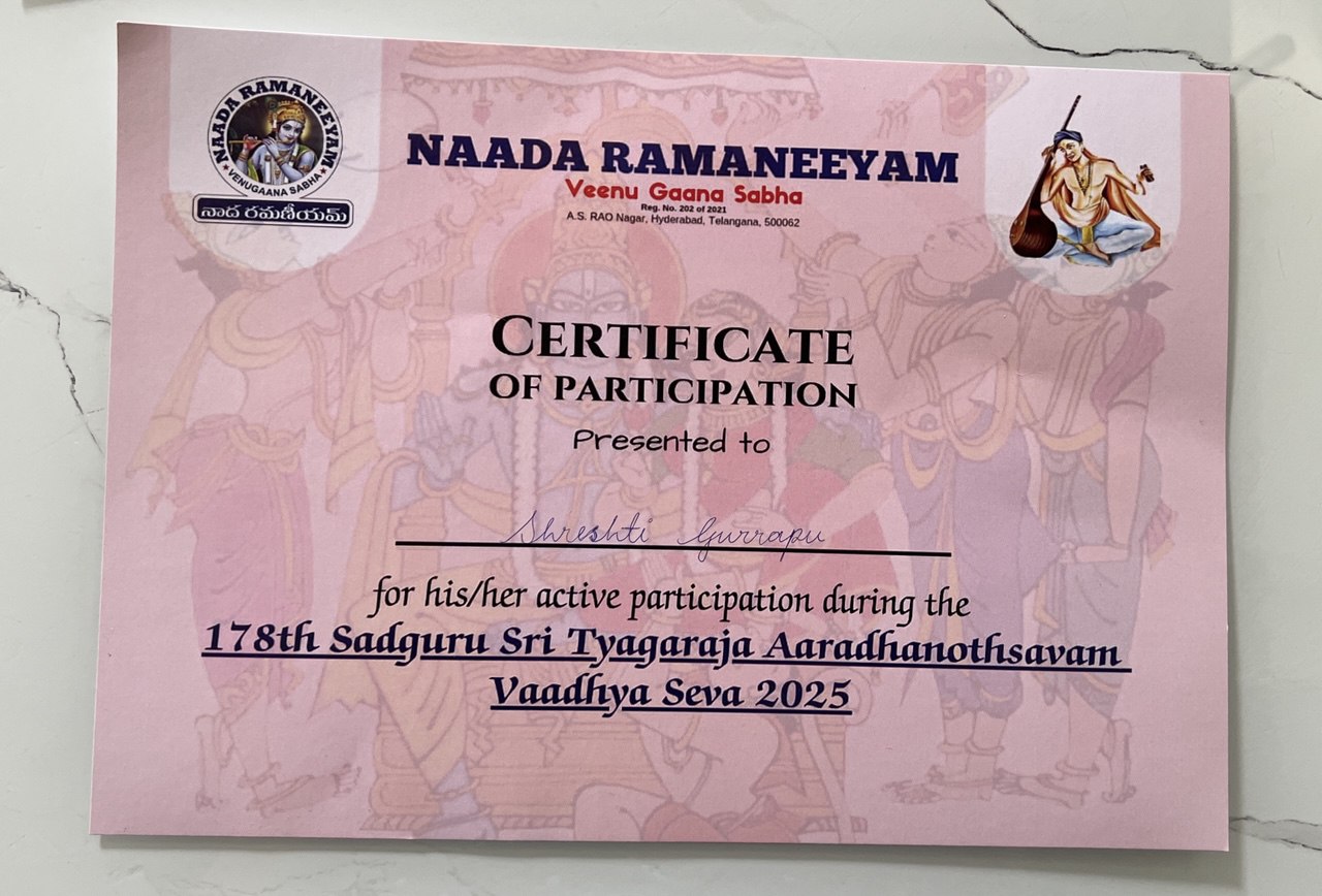 Pursuing higher secondary education through homeschooling. This enables me to balance Carnatic violin, performances, technology projects, and rigorous academics.